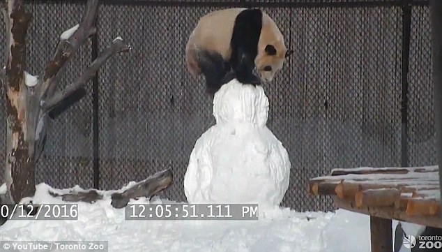 玩耍時(shí)光:大毛用爪子抓著雪人,爬到它身上,一度還爬到了雪人頭上。