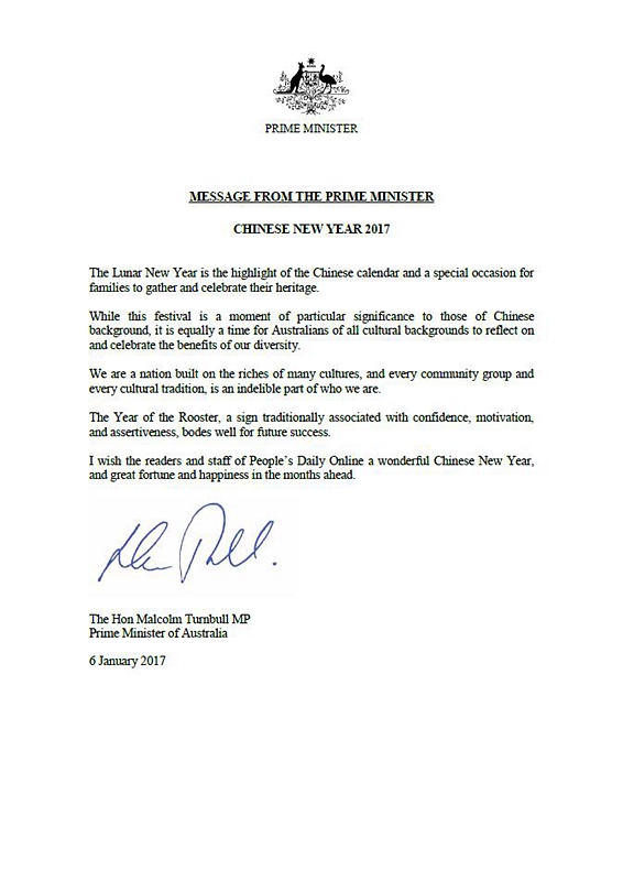在中國(guó)農(nóng)歷雞年到來之際,澳大利亞總理馬爾科姆·特恩布爾向人民網(wǎng)發(fā)來新春賀電,全文如下: