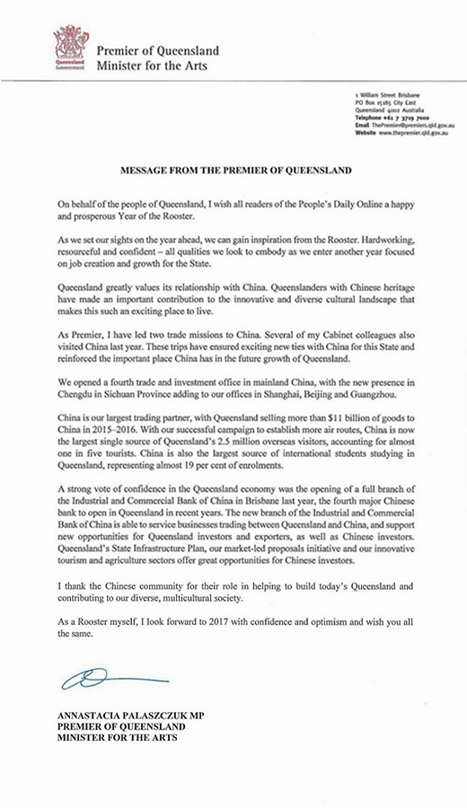 在此謹代表昆士蘭州人民,祝愿人民網所有讀者雞年幸福、富貴、安康!