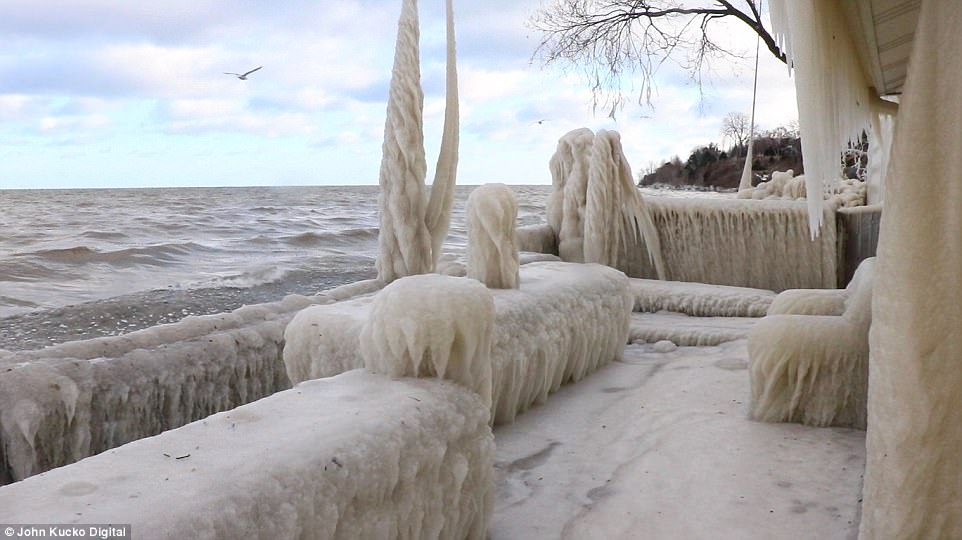 安大略湖飛濺出的水花(如圖)加上低至12華氏度的氣溫,導(dǎo)致該建筑物和湖畔的走廊上堆積了厚厚的冰層。