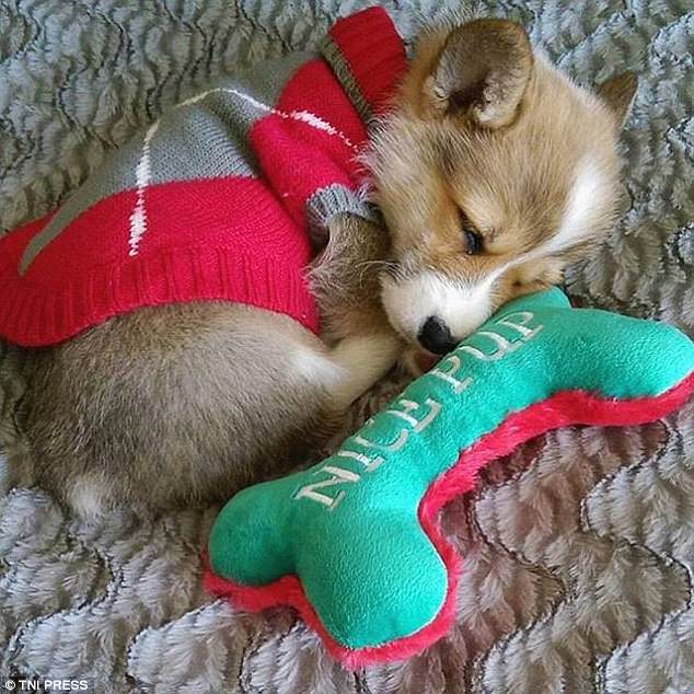 這只小狗穿著套頭針織衫,蜷曲在它的毛絨玩具里,睡得真香甜