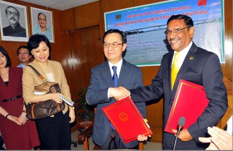 2015年8月,時任商務(wù)部長高虎城(中)率中國政府經(jīng)貿(mào)代表團(tuán)在達(dá)卡出席援孟加拉孟中友誼七橋項目交接儀式