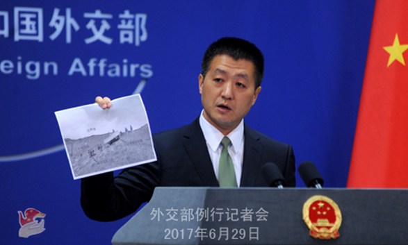 外交部發(fā)言人陸慷6月29日在例行記者會上向與會記者展示印方非法越界的照片。