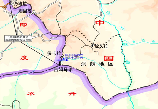 從法理上看,1890年歷史界約明確規(guī)定了吉姆馬珍雪山是中印不三國交界點,洞朗地區(qū)在中印、中不邊界的中方一側(cè)。