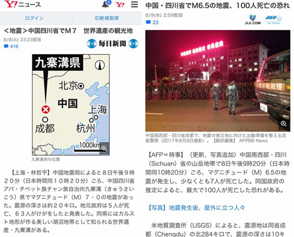 日本雅虎、《每日新聞》、日本電視臺(tái)等在內(nèi)的日本媒體對(duì)九寨溝震情進(jìn)行了報(bào)道。
