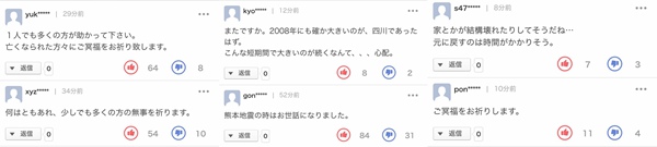 有日本網(wǎng)友感同身受回憶起熊本地震,留言稱熊本地震時(shí)受到來自中國的關(guān)照。還有日本網(wǎng)友在8日深夜留言:看了新聞后突然心里很亂再也睡不著了,之前四川也發(fā)生過大地震,大家挺過來了,相信這次也應(yīng)該沒問題。