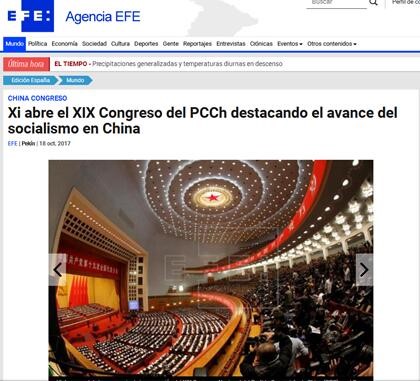 西班牙埃菲社10月18日在首頁世界新聞?lì)^條位置,對十九大進(jìn)行了報(bào)道。報(bào)道稱,十九大開幕會上,習(xí)近平指出,“中國特色社會主義進(jìn)入新時(shí)代”、“六千多萬貧困人口穩(wěn)定脫貧”。