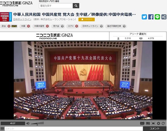 中國共產(chǎn)黨第十九次全國代表大會10月18日在北京開幕,引發(fā)了日本各大媒體的高度關(guān)注,日本最大的視頻網(wǎng)站niconico對此進(jìn)行了直播, 并配有同聲傳譯,便于日本網(wǎng)友觀看。
