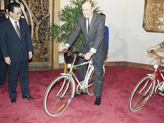 李鵬送給老布什夫婦兩輛“飛鴿牌”自行車,這位當(dāng)年喜歡和夫人芭芭拉在北京街頭騎車的美國總統(tǒng)興致勃勃地跨上車子,在眾多記者面前擺出騎行的姿勢。 老布什在這次出訪期間接受了中央電視臺的采訪,成為首位在中國熒屏上向中國人發(fā)表談話的美國總統(tǒng)。