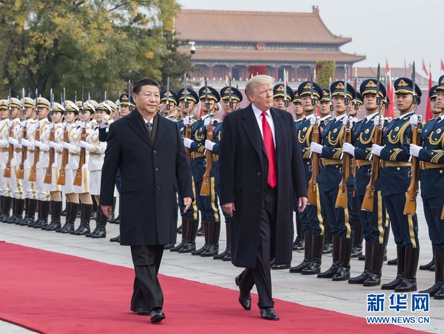 11月9日,國家主席習(xí)近平在北京人民大會(huì)堂東門外廣場(chǎng)舉行歡迎儀式,歡迎美利堅(jiān)合眾國總統(tǒng)唐納德·特朗普對(duì)中國進(jìn)行國事訪問。 新華社記者李濤攝
