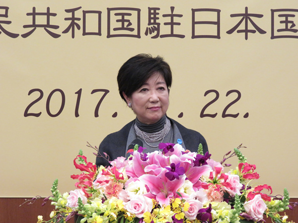 東京都知事小池百合子在致辭中對以程永華大使為首的中國大使館及東京都所屬各區(qū)、市政府、議會及民間團(tuán)體等為增進(jìn)日中兩國以及東京與北京的友好關(guān)系和相互理解所做的貢獻(xiàn)表示敬意。小池知事表示,45年前,日中兩國建交時,中國曾贈給日本一對大熊貓“康康”和“蘭蘭”作為友好的使者。而今天,東京上野動物園剛剛公布了熊貓寶寶“香香”將于12月19日正式與各國游客見面的消息,這也象征了日中友好傳承不息的意義。地方交流對于發(fā)展健全的日中戰(zhàn)略互惠關(guān)系起著很好的作用。近年來,東京與北京在各領(lǐng)域交流都取得巨大成績,希望進(jìn)一步鞏固和密切兩地的友城關(guān)系,為日中友好關(guān)系的發(fā)展貢獻(xiàn)力量。