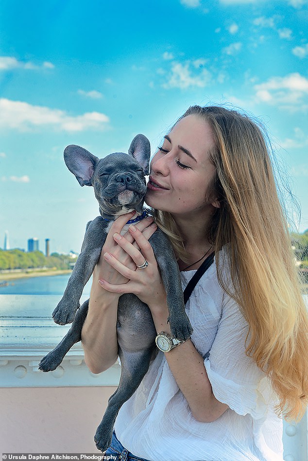 倫敦艾伯特大橋上,新聞系學生阿納斯塔西婭和她的法國斗牛犬。