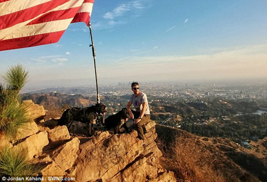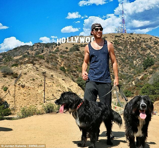 30歲的卡哈納和他救助的兩只狗——宙斯和塞多娜——站在好萊塢標(biāo)志前。