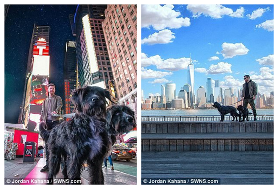卡哈納帶著小狗參觀紐約的時代廣場(左圖)和布魯克林(右圖)。