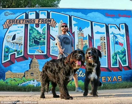 卡哈納和狗狗們在得克薩斯州一處壁畫前擺造型。
