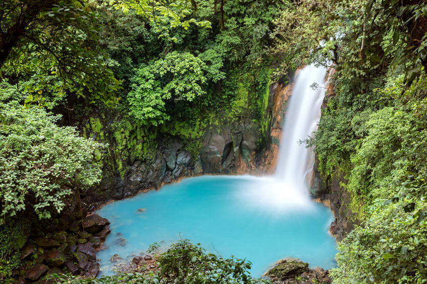 哥斯達(dá)黎加的Tenorio火山國家公園,Rio Celeste瀑布瀉入湛藍(lán)水池中。