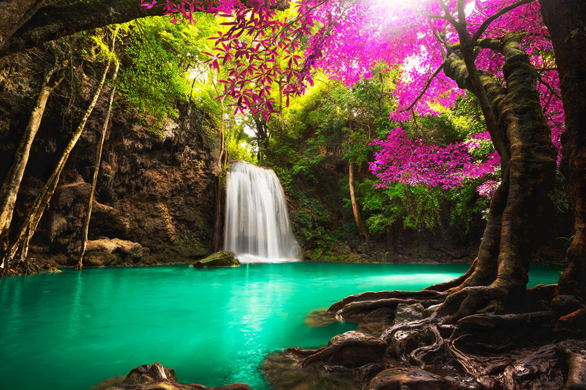 陽光透過五彩斑斕的樹葉照射在泰國愛侶灣國家公國里的一處小瀑布。