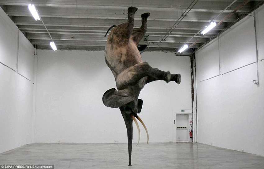 2008年,在巴黎東京的“超級(jí)穹頂”展覽上,當(dāng)代藝術(shù)家丹尼爾·菲爾曼精心設(shè)計(jì)的大象雕塑,龐大的身軀在鼻子上搖搖欲墜。