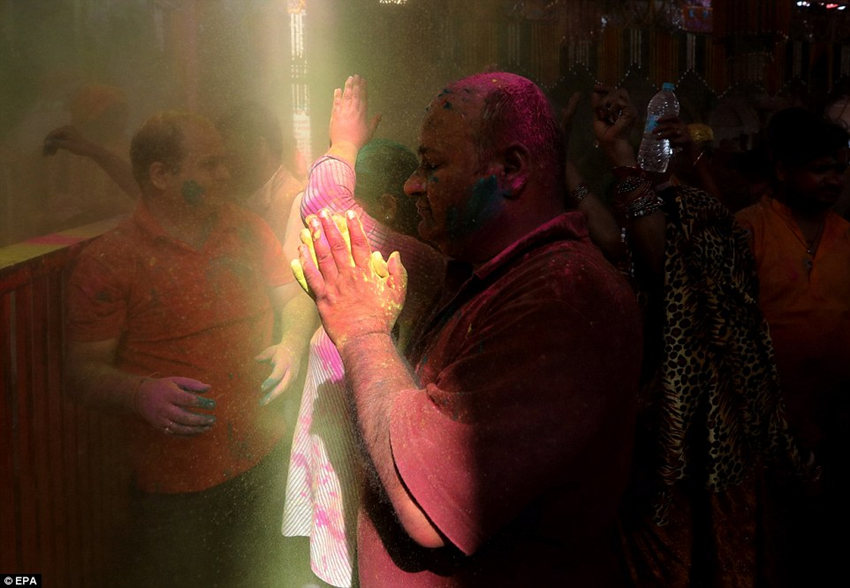 狂歡中祈禱的人,全身都是粉色、黃色和橙色的粉末。
