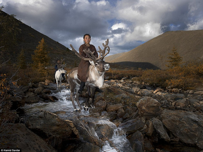 在蒙古的庫蘇古爾省,一名女子騎著鹿穿過一段巖石溪流。