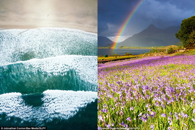 左圖是喬納森·康侖(Jonathan Conlon)從高空處拍下了哈里斯島的海灘景色,浪尖上的白色泡沫充斥著整張照片。這幅圖也獲得了海景小組的第一名。右圖是珍妮·拉森比(Jeanie Lazenby)拍攝的蘇格蘭高地格倫科大俠谷的景色,陽光和陣雨,風(fēng)信子和彩虹……這幅圖成為春季景象小組的最佳作品。
