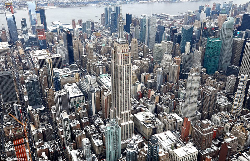 暴雪之后,紐約各建筑物頂層都被積雪覆蓋,積雪厚度達(dá)3英寸(約7.6厘米)。
