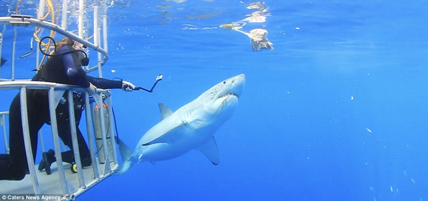 就在它撞到籠子之前,鯊魚抓到了一大塊肉餌。