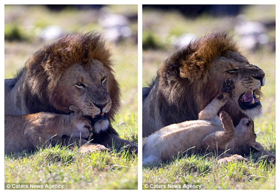 小獅子把爪子伸到雄獅嘴里,玩耍它的大獠牙。