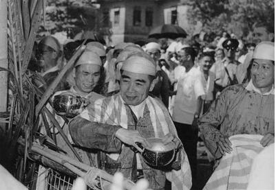 關(guān)于潑水節(jié),中緬友好史上還有一段佳話。1960年4月,周恩來總理訪問緬甸時,正好趕上潑水節(jié),他身穿緬甸傳統(tǒng)的籠基,頭戴緬甸傳統(tǒng)的禮帽,走上街頭,與民同樂,手持銀碗,潑水祝福,親如一家。