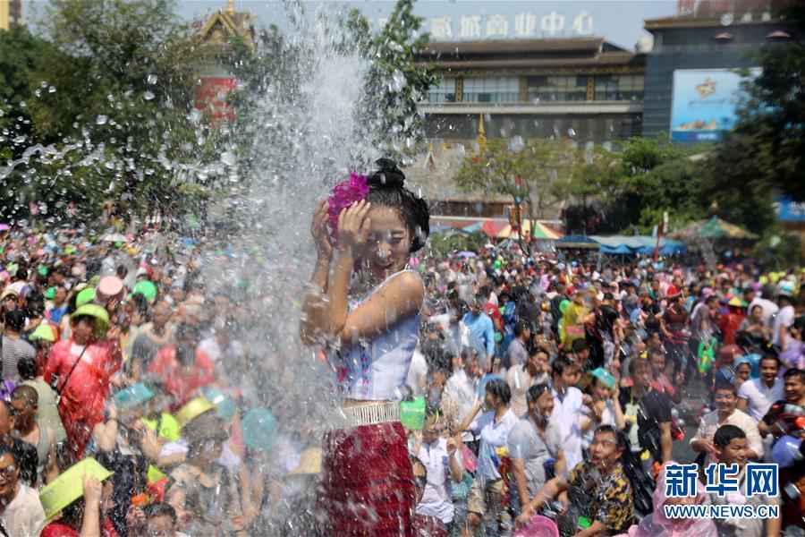 人們?cè)谠颇鲜∥麟p版納傣族自治州景洪市潑水廣場(chǎng)潑水狂歡。 新華社發(fā)(邵濱攝)