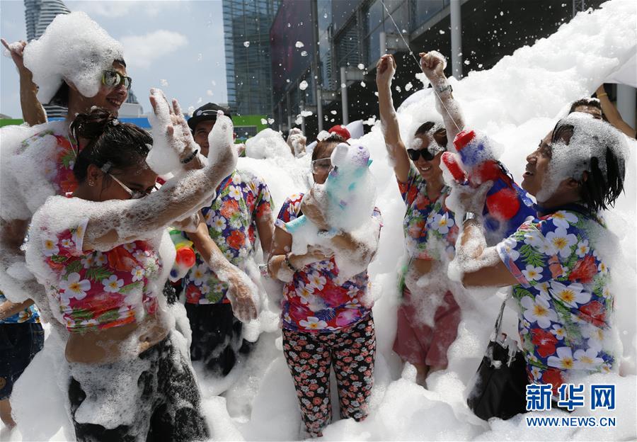 在泰國曼谷,人們以泡沫浴形式慶祝潑水節(jié)。新華社/歐新
