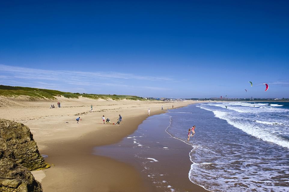 南泰恩賽德的Sandhaven海灘,英格蘭東北地區(qū)六個(gè)被授予藍(lán)旗的海灘之一。孩子們?cè)谒型嫠#渌藙t在海灘上放風(fēng)箏。