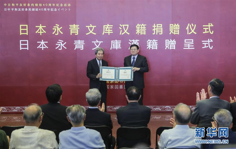 6月26日,捐贈(zèng)儀式上,國家圖書館館長韓永進(jìn)(右)代表國家圖書館向日本前首相、永青文庫理事長細(xì)川護(hù)熙頒發(fā)捐贈(zèng)證書。當(dāng)日,日本永青文庫向國家圖書館捐贈(zèng)漢籍儀式在國家圖書館典籍博物館舉行。永青文庫在中日和平友好條約締結(jié)40周年之際將細(xì)川家族數(shù)代人收藏的36部4175冊(cè)珍貴漢籍無償贈(zèng)予中國國家圖書館。新華社記者 殷剛 攝