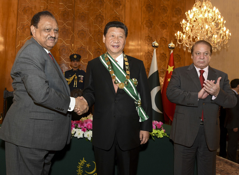 2015年4月21日,習(xí)近平會(huì)見巴基斯坦總統(tǒng)侯賽因,會(huì)見后,侯賽因向習(xí)近平授予“巴基斯坦勛章”。