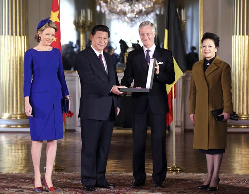 2014年3月30日,比利時(shí)國(guó)王菲利普向習(xí)近平授予“利奧波德大綬帶”勛章和證書。