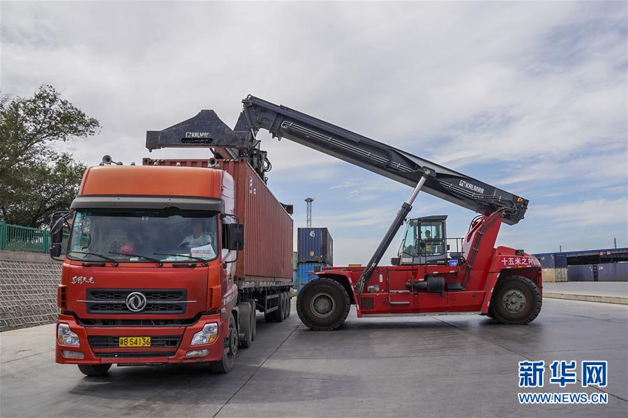 在中歐班列烏魯木齊集結(jié)中心,工人操作起重機(jī)卸貨(8月9日攝)。