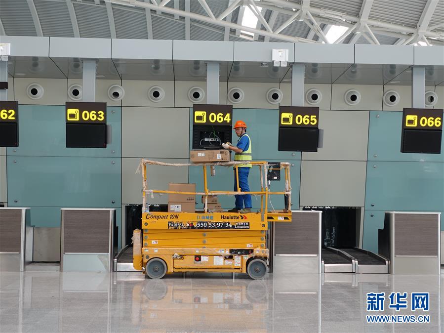 8月10日,中國工人在即將完工交付的阿爾及利亞阿爾及爾新機(jī)場旅客出發(fā)大廳安裝設(shè)備。