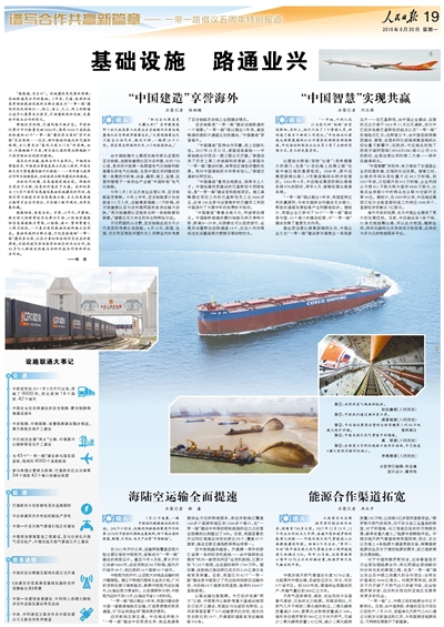 “道路通,百業(yè)興”。設(shè)施建設(shè)是發(fā)展的前提;設(shè)施聯(lián)通是合作的基礎(chǔ)。5年來,交通、能源和信息等領(lǐng)域基礎(chǔ)設(shè)施的互聯(lián)互通成為“一帶一路”建設(shè)的優(yōu)先領(lǐng)域之一,陸上、海上、天上、網(wǎng)上的聯(lián)通正逐步從愿景變?yōu)楝F(xiàn)實(shí),引領(lǐng)著瓶頸的突破、發(fā)展的升級與合作的深化。