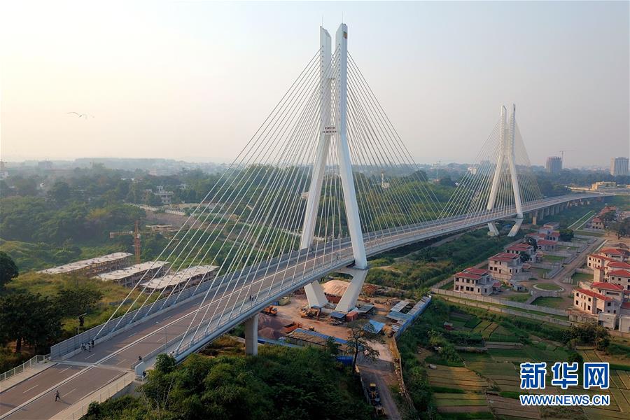 這是2018年6月10日在剛果(布)首都布拉柴維爾拍攝的由中國承建的布拉柴維爾沿河大道斜拉橋(航拍照片)。(新華社記者 王騰 攝)