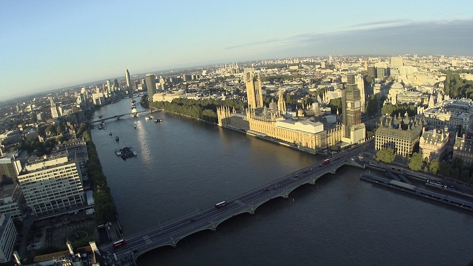 當(dāng)太陽升起時(shí),鳥瞰議會(huì)大廈和泰晤士河。