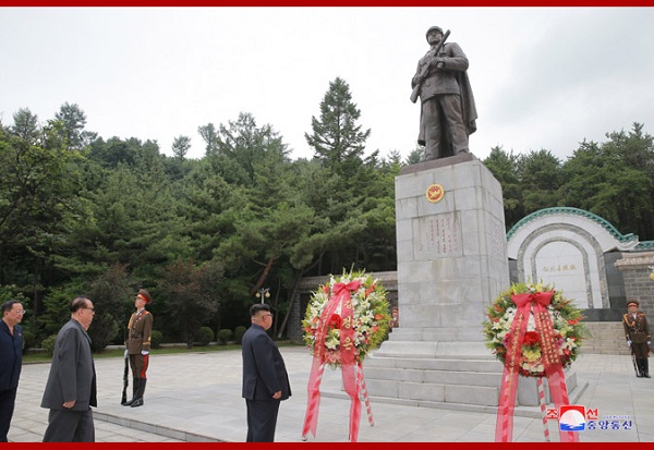 7月27日,金正恩向檜倉中國人民志愿軍烈士陵園敬獻(xiàn)花圈。(圖片來源:朝中社)