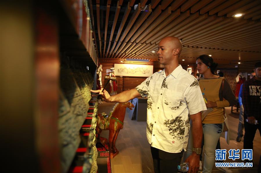 9月28日,在北京孔子學(xué)院總部舉辦的第五屆“開放日”活動上,一位外賓體驗演奏編鐘。 新華社發(fā)