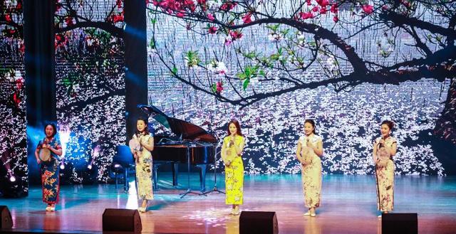 第一篇章“雅韻蘇州河”。一首首江南小調(diào)、絲竹曲韻娓娓道來。上海經(jīng)典老歌--《蘇州河邊》,被譽為“春申小夜曲”,優(yōu)雅內(nèi)斂,綿綿情思,柔腸百結(jié)。民歌聯(lián)唱《太湖美》、《秦淮景》、《拔根蘆柴花》、《茉莉花》優(yōu)美靈動,吳儂軟語、清細柔美。器樂三重奏《彈詞韻》以蘇州彈詞元素為題材創(chuàng)作,琵琶、揚琴、古箏交相輝映,如行云流水,仿若彈詞婀娜。《漁舟唱晚》在鋼琴、蕭的伴奏下,歌聲悠揚委婉,生動呈現(xiàn)“落霞與孤鶩齊飛,秋水共長天一色”的天人合一的境界。