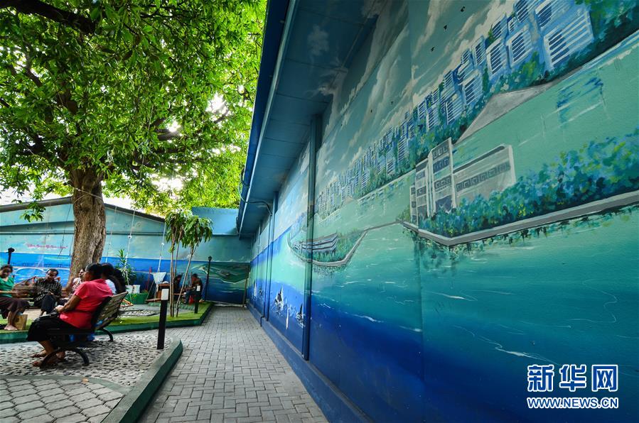 這是10月12日在馬爾代夫馬累勒汗迪·邁贊街心公園內(nèi)拍攝的中馬友誼大橋巨幅畫作局部。 在馬爾代夫首都馬累,除了為人熟知的跨海中馬友誼大橋外,還有一座“中馬友誼大橋”,不過這座“橋”并不在水里,而在馬累一個街心花園的墻壁上。 新華社發(fā)(杜才良攝)