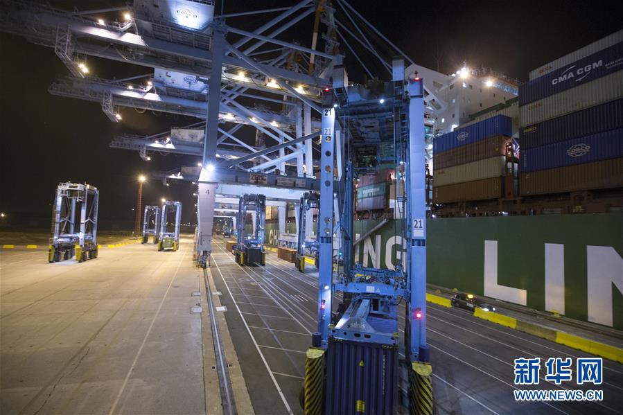 10月15日晚,在比利時澤布呂赫港集裝箱碼頭,跨運車運送集裝箱。 新華社記者 葉平凡 攝