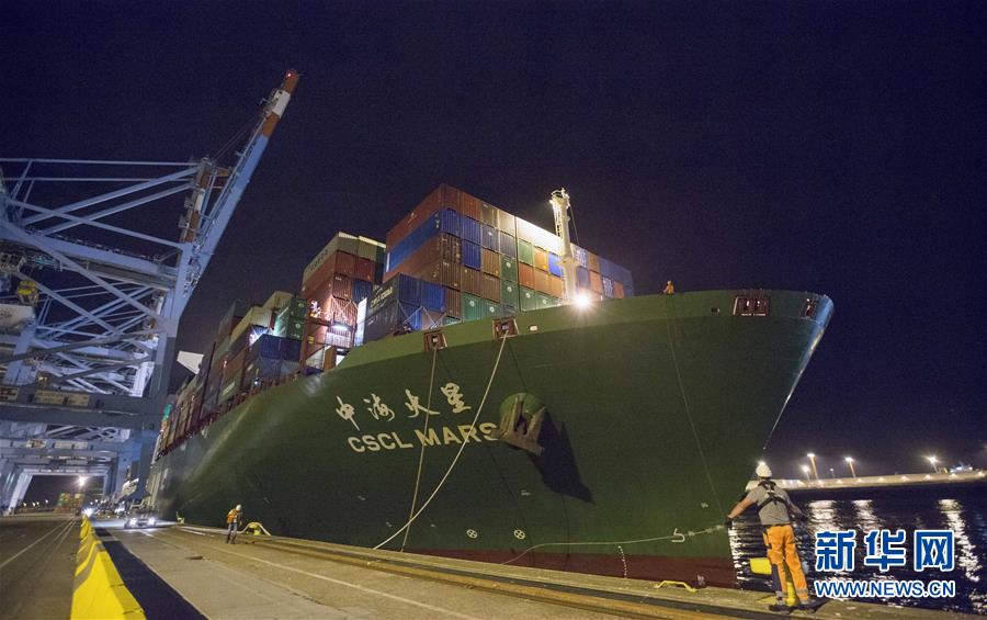 10月15日晚,中遠(yuǎn)海運(yùn)旗下的“中;鹦恰碧(hào)集裝箱輪?吭诒壤麜r(shí)澤布呂赫港集裝箱碼頭。 新華社記者 葉平凡 攝