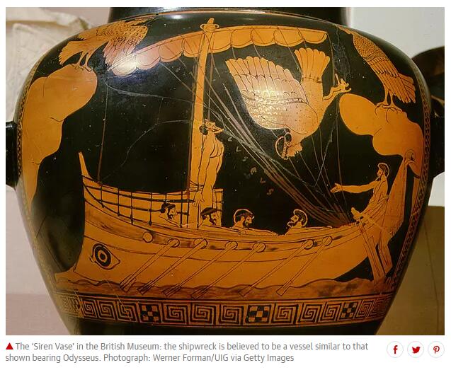 這只保存在英國博物館中的陶罐上所繪的船只與發(fā)現(xiàn)的沉船類似。畫面中,古希臘神話中的奧德修斯正乘船渡過海妖塞壬出沒的海域。網(wǎng)頁截圖