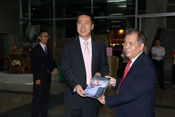 圖為朱拉隆功大學(xué)孔子學(xué)院院長(zhǎng)傅增有教授向中國(guó)駐泰國(guó)大使館公參楊欣贈(zèng)送孔院雜志。