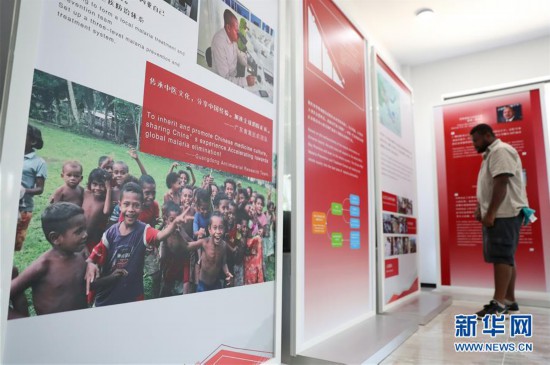 11月10日,在巴布亞新幾內(nèi)亞莫爾茲比港中國(廣東)-巴新瘧疾防治中心,一位市民觀看巴新基里維納群島抗瘧試驗區(qū)的展板。記者白雪飛攝