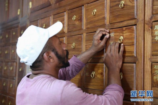 11月10日,在巴布亞新幾內(nèi)亞莫爾茲比港中國(廣東)-巴新瘧疾防治中心,一位工作人員為防治中心的中藥房藥箱安裝中文說明。 記者白雪飛攝